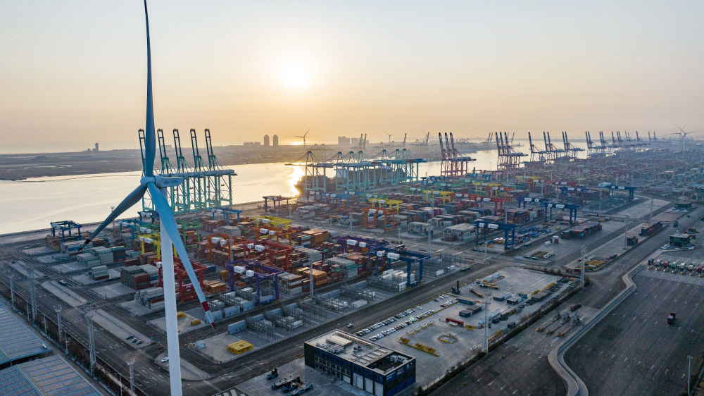 看似平常的碼頭作業(yè),背后卻另有玄機(jī)——整個(gè)過程達(dá)到了“零碳”排放。2021年底,隨著兩臺(tái)風(fēng)機(jī)葉片緩緩啟動(dòng),這座全球首個(gè)“智慧零碳”碼頭的智慧綠色能源系統(tǒng)開始并網(wǎng)發(fā)電,通過風(fēng)電、光伏發(fā)出的綠色能源,源源不斷為碼頭生產(chǎn)提供能源。