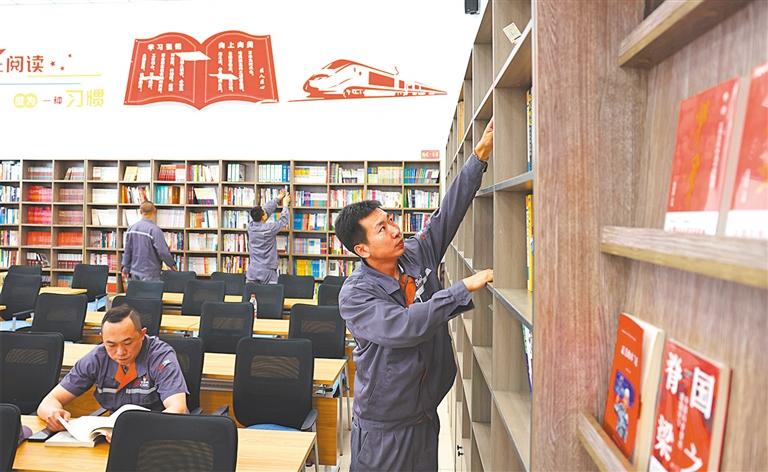 ▲5月28日,中車長客職工書屋,周晶輝國家技能大師工作室成員利用休息時(shí)間忙“充電”。