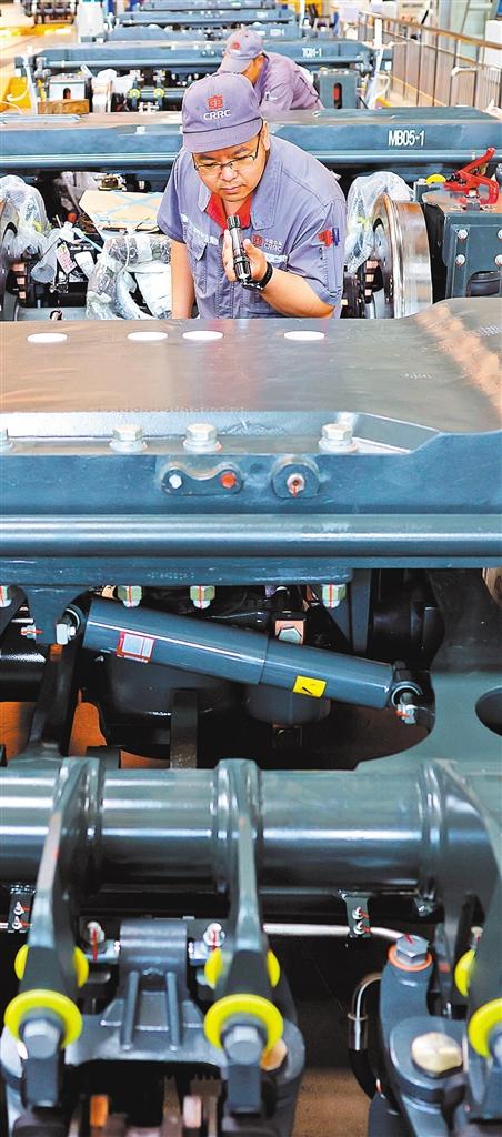 ?5月28日,中車長客轉(zhuǎn)向架事業(yè)部總成產(chǎn)線組,一臺(tái)臺(tái)轉(zhuǎn)向架排列在數(shù)字化智能產(chǎn)線上。
