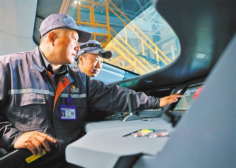 ?5月28日,中車長客首席操作師羅昭強(qiáng)(前一)在對(duì)新一批復(fù)興號(hào)智能動(dòng)車組進(jìn)行出廠前的質(zhì)量檢查。