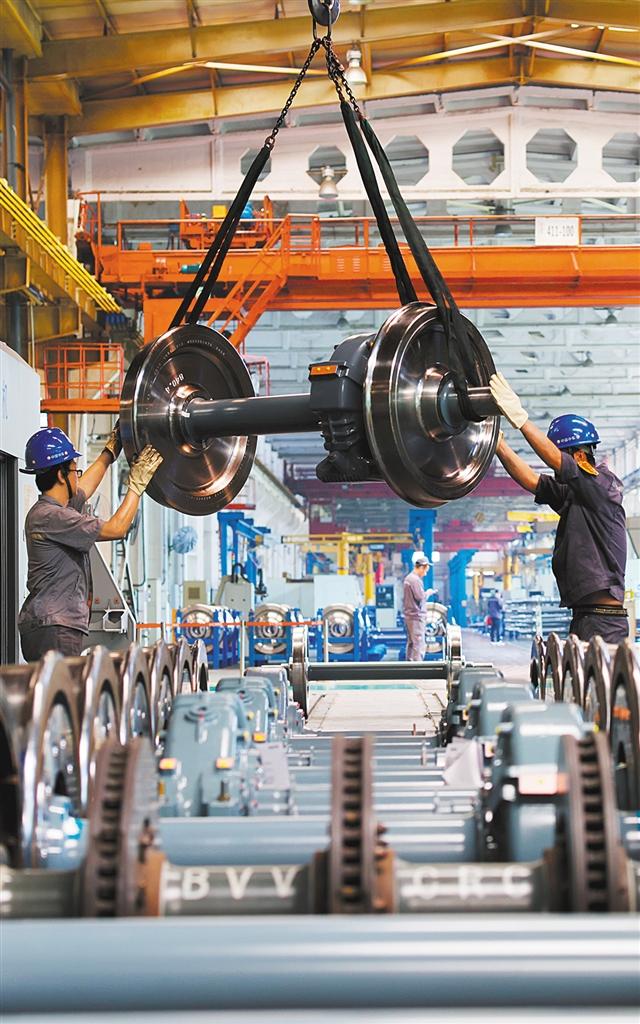 ▼5月28日,中車長客轉(zhuǎn)向架事業(yè)部總成產(chǎn)線組,員工在進(jìn)行城軌輪對(duì)壓裝作業(yè)。
