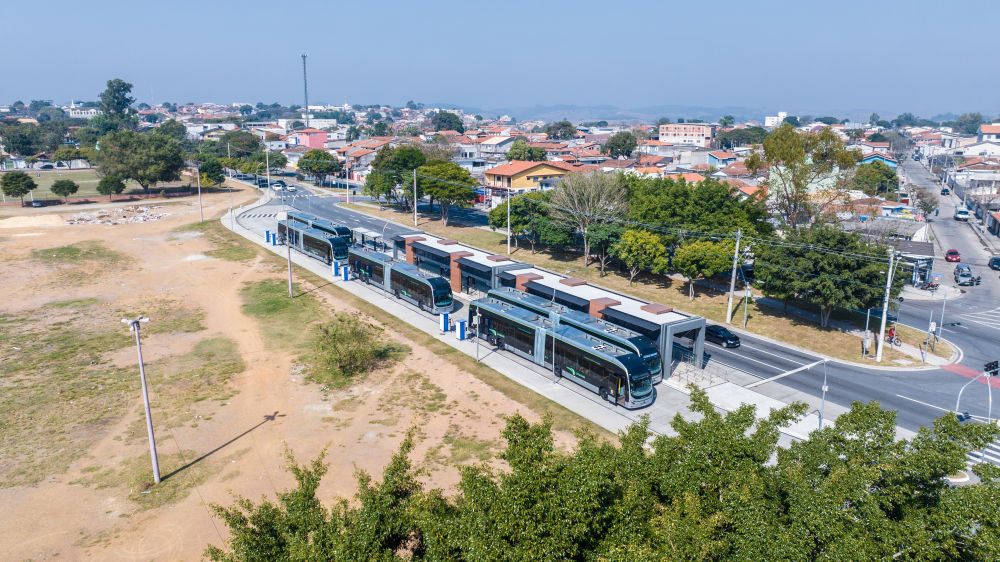 這是2023年7月12日在巴西圣保羅州圣若澤杜斯坎普斯快速公交系統(tǒng)“綠線”始發(fā)站拍攝的比亞迪純電動大巴(無人機(jī)照片)。新華社記者王天聰攝