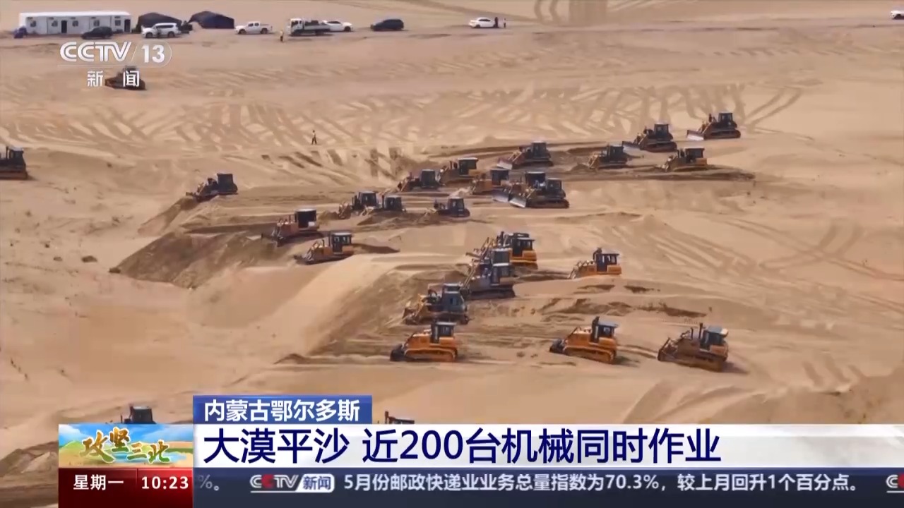 此刻,在我身后,近200臺推土機(jī)正在這片沙漠上來回穿行,他們要把這些高低起伏、連綿不斷的沙丘推平整了,再安裝光伏板。這么多推土機(jī)具體是如何作業(yè)的?技術(shù)人員告訴我們,因?yàn)榈匦蔚脑?,今天現(xiàn)場的推平作業(yè)大致分為兩個(gè)梯隊(duì):第一梯隊(duì)負(fù)責(zé)在沙丘的最上面,把頂部的沙子推下來;第二梯隊(duì)隨后,填平沙坑,平整現(xiàn)場。
