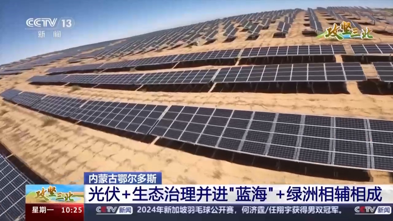 總臺記者 李欣蔓:此時(shí)此刻,我就在庫布其沙漠的西側(cè)腹地。拿我現(xiàn)在所在的杭錦旗朔方新能源大基地來說,這里正在探索建設(shè)的就是當(dāng)下最新的光伏治沙模式。說到光伏發(fā)電,我們已經(jīng)很熟悉了,那光伏治沙怎么治?今天我們就在現(xiàn)場找一下答案。