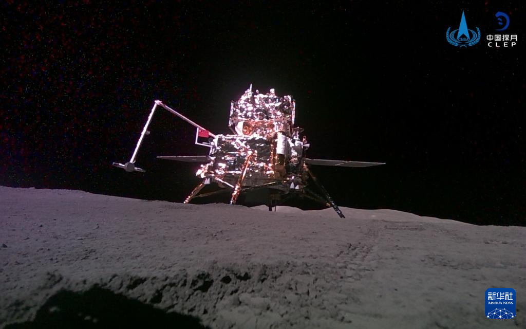 6月3日,嫦娥六號攜帶的“移動相機(jī)”自主移動后拍攝并回傳的著陸器和上升器合影。新華社發(fā)(國家航天局供圖)