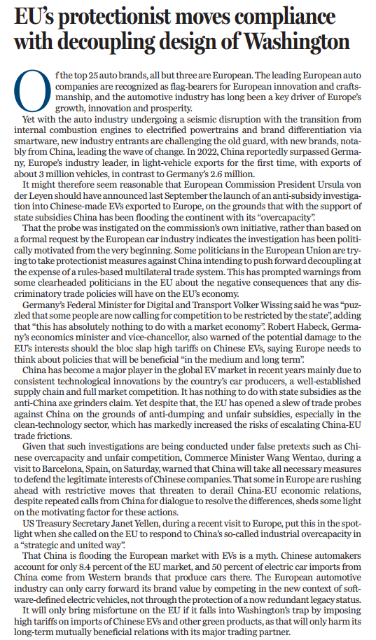 美國(guó)財(cái)政部部長(zhǎng)耶倫近期訪歐期間呼吁,歐盟要以“戰(zhàn)略與聯(lián)合的方式”應(yīng)對(duì)中國(guó)所謂的產(chǎn)能過(guò)剩,引來(lái)多方關(guān)注。