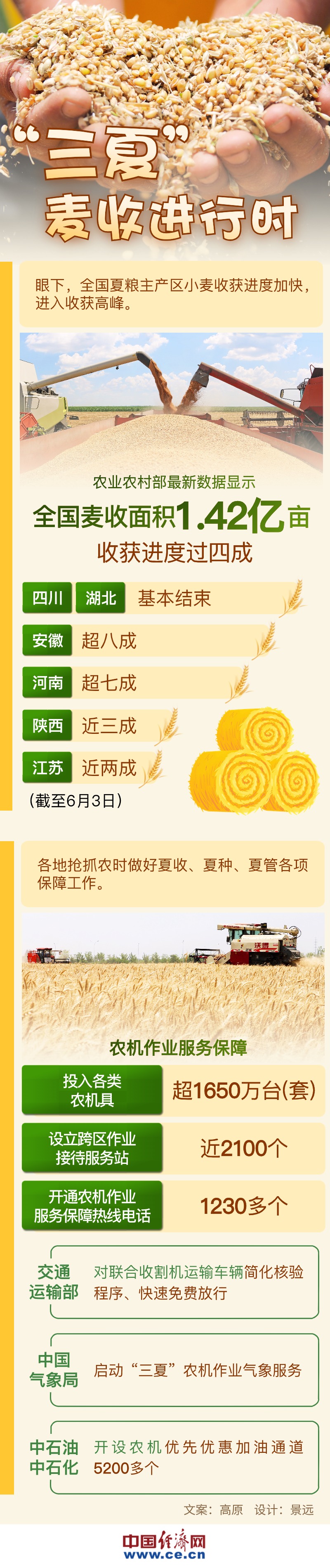 進(jìn)入六月,全國(guó)“三夏”大規(guī)模小麥機(jī)收工作全面展開,收獲進(jìn)度加快。據(jù)農(nóng)業(yè)農(nóng)村部最新數(shù)據(jù)顯示,截至6月3日,全國(guó)麥?zhǔn)彰娣e1.42億畝,收獲進(jìn)度過四成。