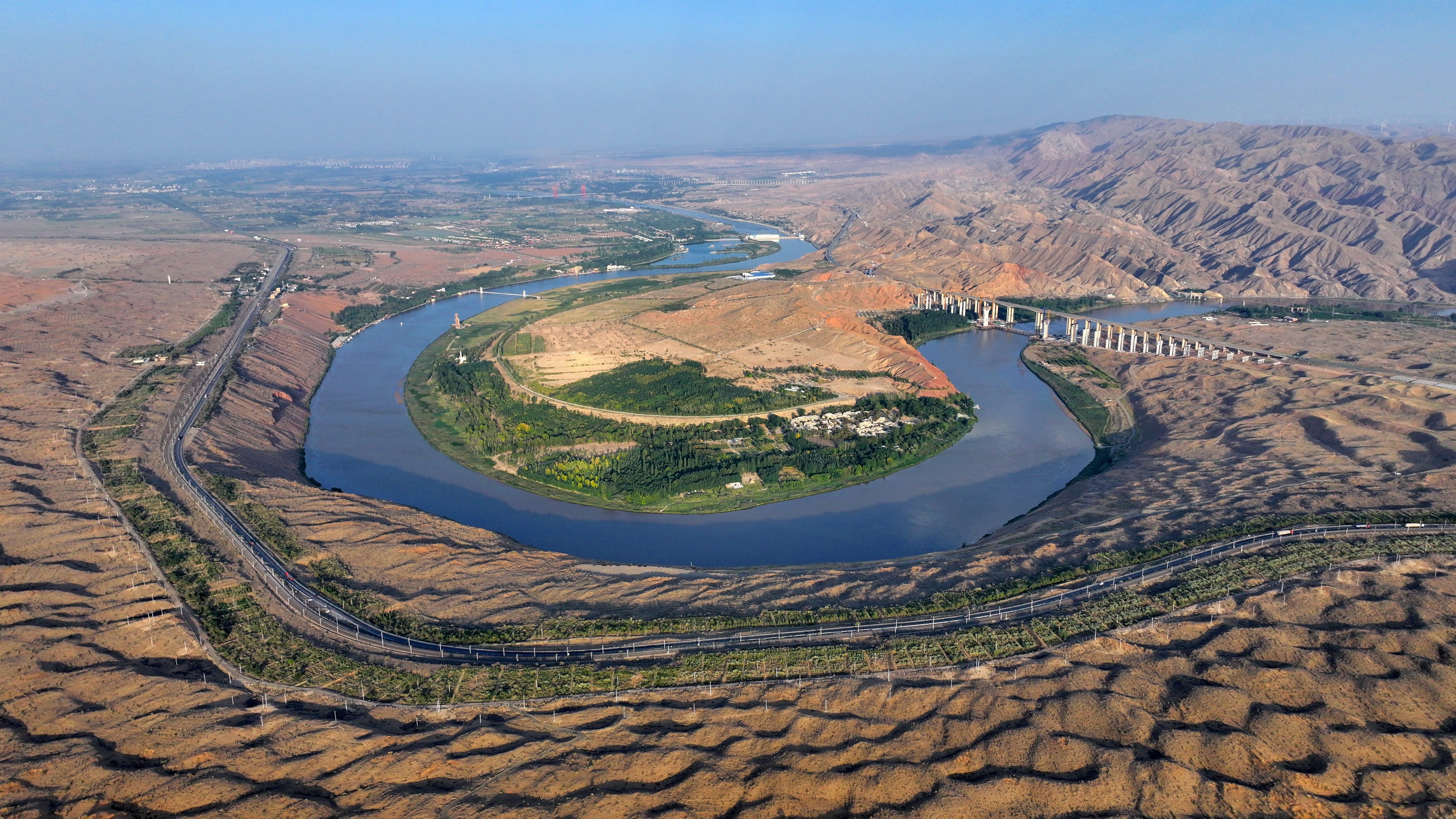 如今,在當?shù)赜嘘P(guān)部門開展的水系疏浚工程影響下,這里成為沙漠濕地的聚集地。黃河流經(jīng)此地,畫出了一道蜿蜒的曲線。河的一頭是騰格里沙漠的無垠瀚海,另一頭被一抹蒼翠鑲嵌在河岸邊。