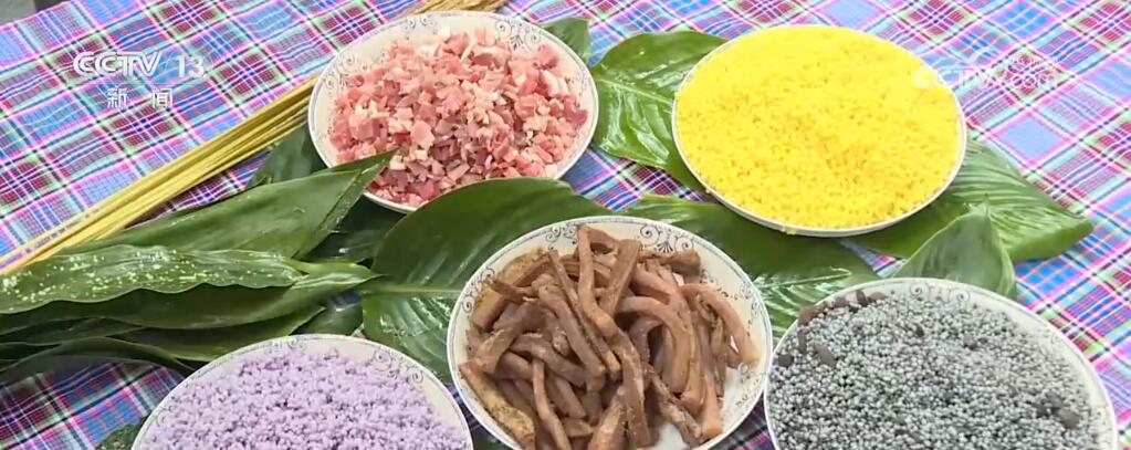 在云南曲靖市師宗縣五龍壯族鄉(xiāng),每年端午,當(dāng)?shù)卮迕窬蜁萌境錾世_紛的“花米飯”作為原料,再加入火腿、臘肉、大棗等輔料制作“七彩粽”。