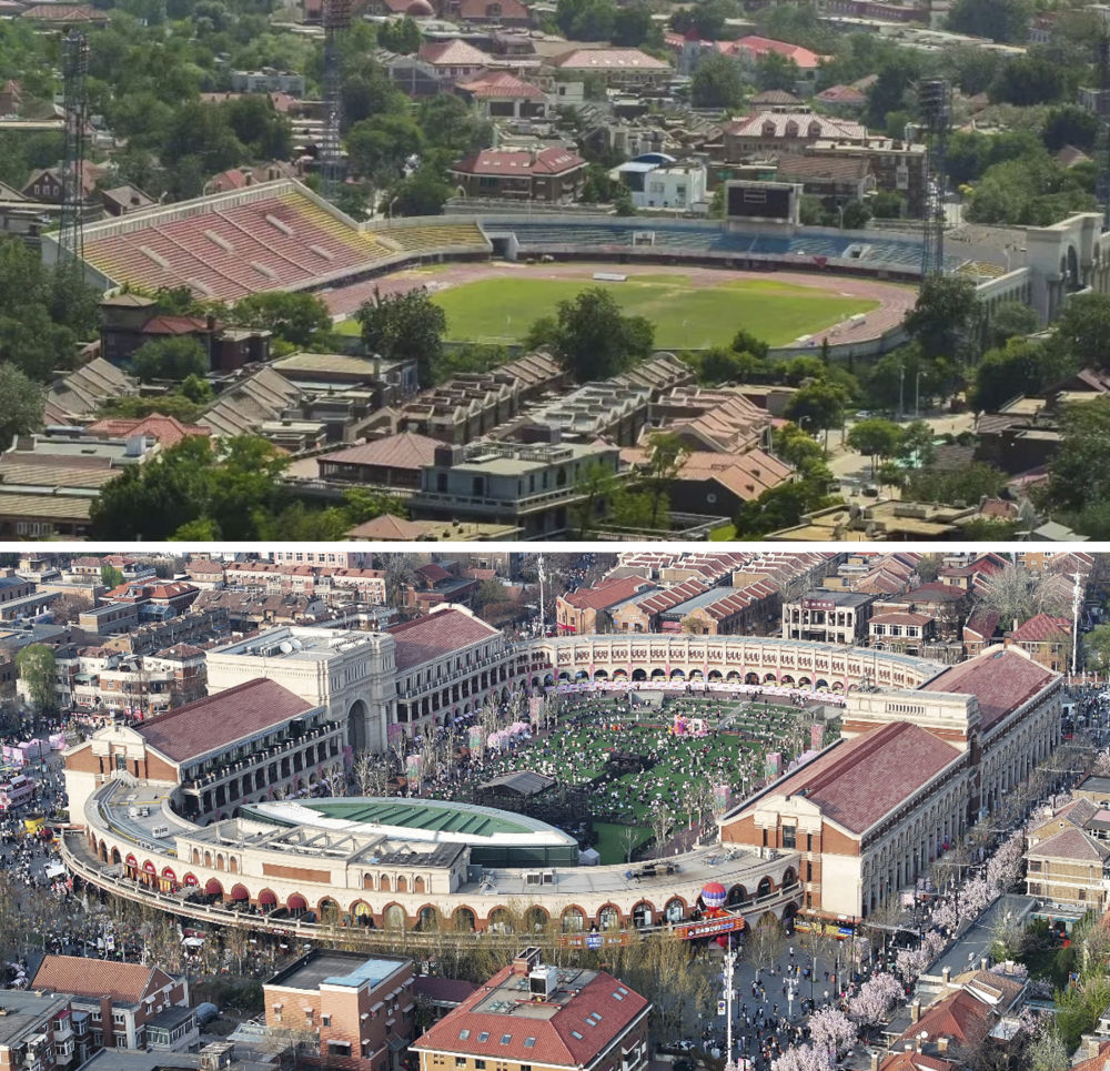 拼版照片:上圖是位于天津五大道的民園體育場(chǎng)(資料照片);下圖是2024年4月6日拍攝的民園廣場(chǎng)(新華社記者趙子碩攝)。民園廣場(chǎng)的前身是始建于1920年的民園體育場(chǎng),曾是中國(guó)的第一個(gè)燈光足球場(chǎng)。經(jīng)過提升改造,現(xiàn)在的民園廣場(chǎng)已經(jīng)成為中西合璧的“城市會(huì)客廳”。新華社發(fā)