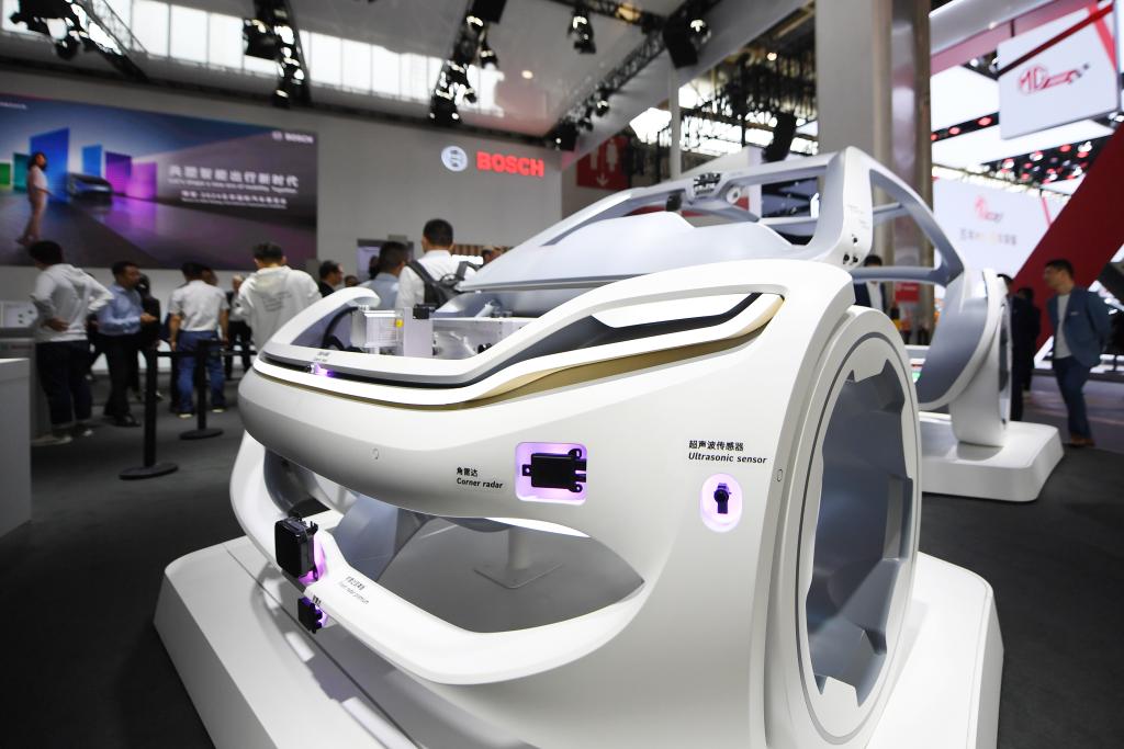 在北京車展上,博世公司展臺(tái)展出可用于新能源汽車智能出行解決方案的相關(guān)產(chǎn)品(4月25日攝)。新華社記者鞠煥宗攝