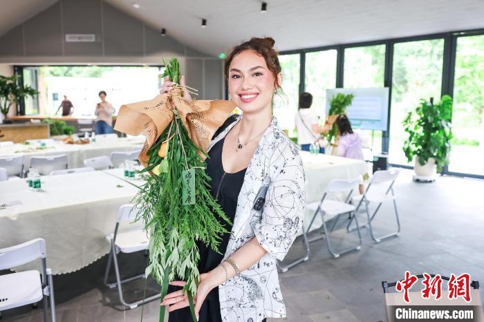 6月10日,漢娜·羅斯展示自己現(xiàn)場制作的菖蒲花束。(主辦方供圖)