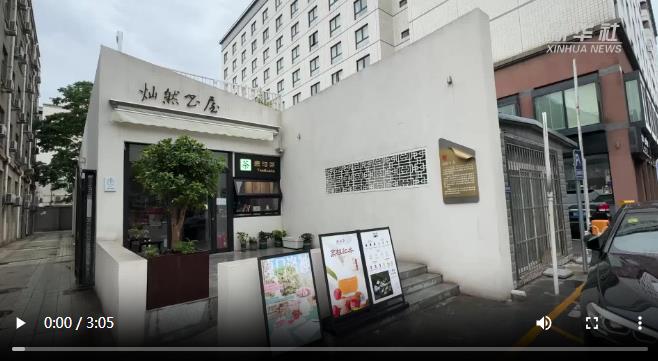雅致的白色二層小樓,一層是書屋,二層是露臺(tái)。一面鏤空幕墻半圍起一個(gè)小巧庭院,“春茶到了”的招牌與蔥蘢繁花相映成趣。