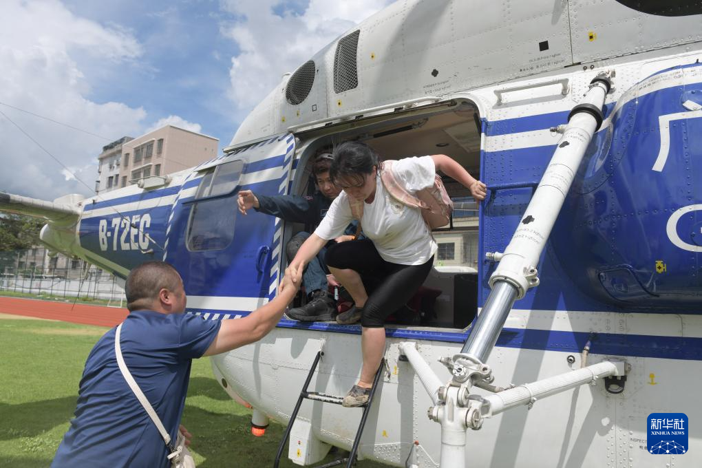 救援直升機將廣東省梅州市平遠縣泗水鎮(zhèn)大新村的村民轉(zhuǎn)移到縣城(6月19日攝)。新華社記者 盧漢欣 攝