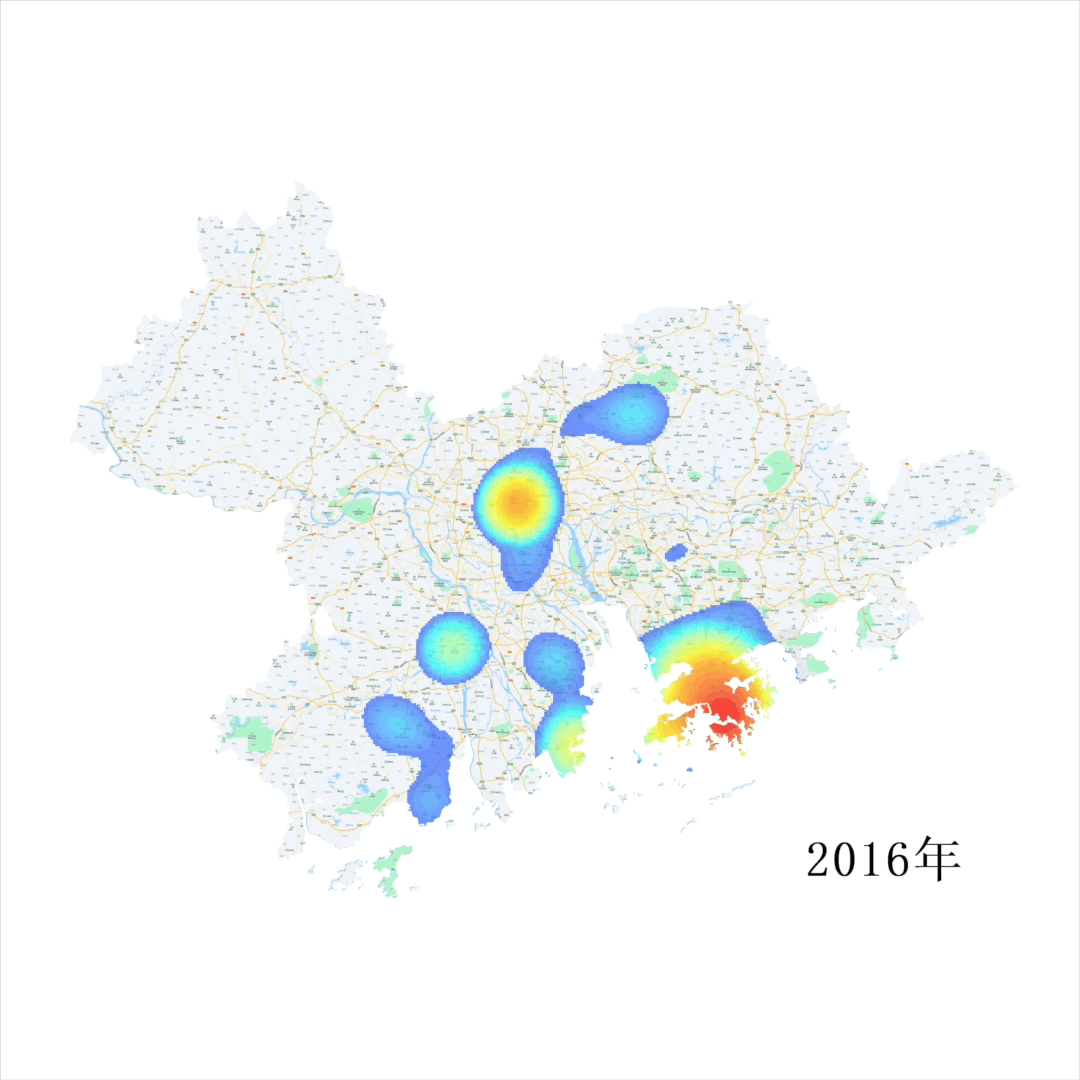 從2016至今,即使相隔珠江口,大灣區(qū)區(qū)域顏色不斷加深,各熱點(diǎn)之間聯(lián)系更加緊密。