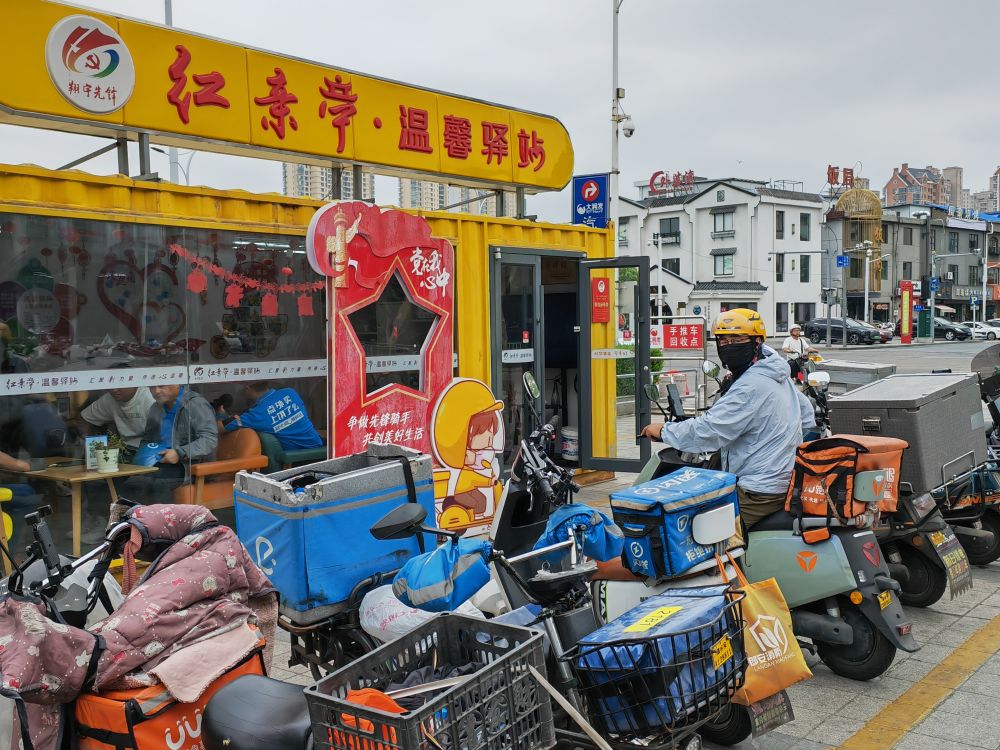 空調(diào)、微波爐、藥箱……記者在江蘇淮安經(jīng)濟(jì)技術(shù)開發(fā)區(qū)大潤發(fā)超市旁的溫馨驛站發(fā)現(xiàn),這里空間不大,但功能齊全。不時(shí)有騎手進(jìn)出,在此短暫休息、補(bǔ)水、給手機(jī)充電、閑聊。