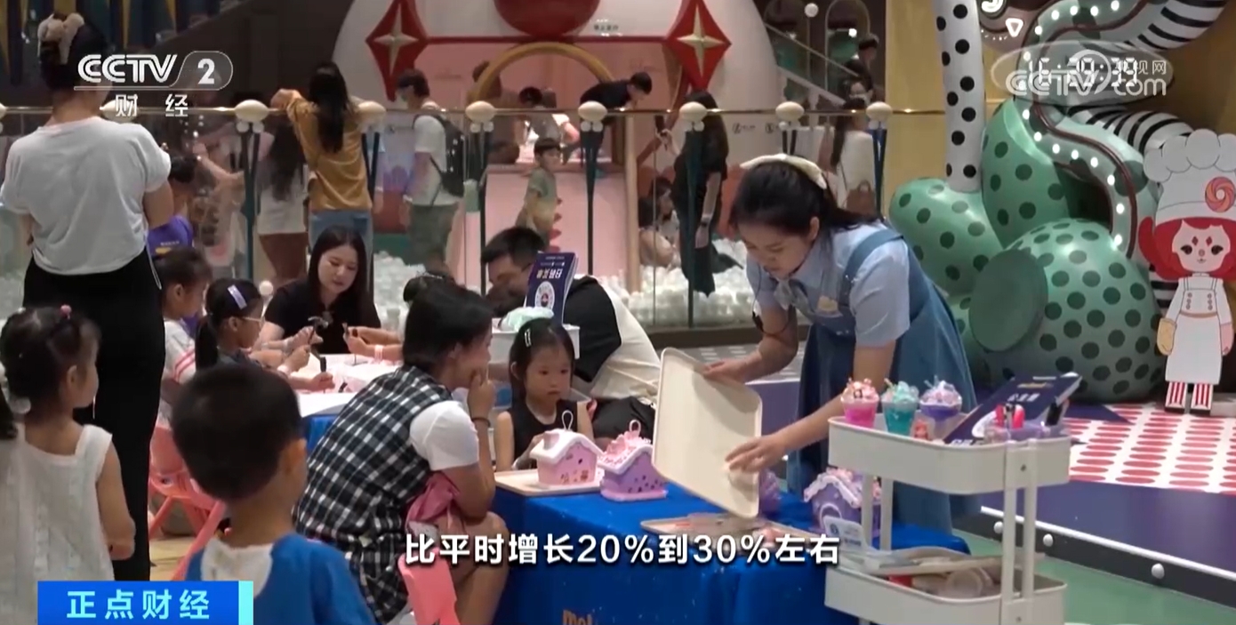 某室內(nèi)游樂(lè)場(chǎng)深圳一方天地店值班經(jīng)理麥麗勤介紹:“比平時(shí)增長(zhǎng)20%至30%左右,因?yàn)楹⒆觽兎偶倭?,家長(zhǎng)們也有空帶孩子們過(guò)來(lái)玩。”