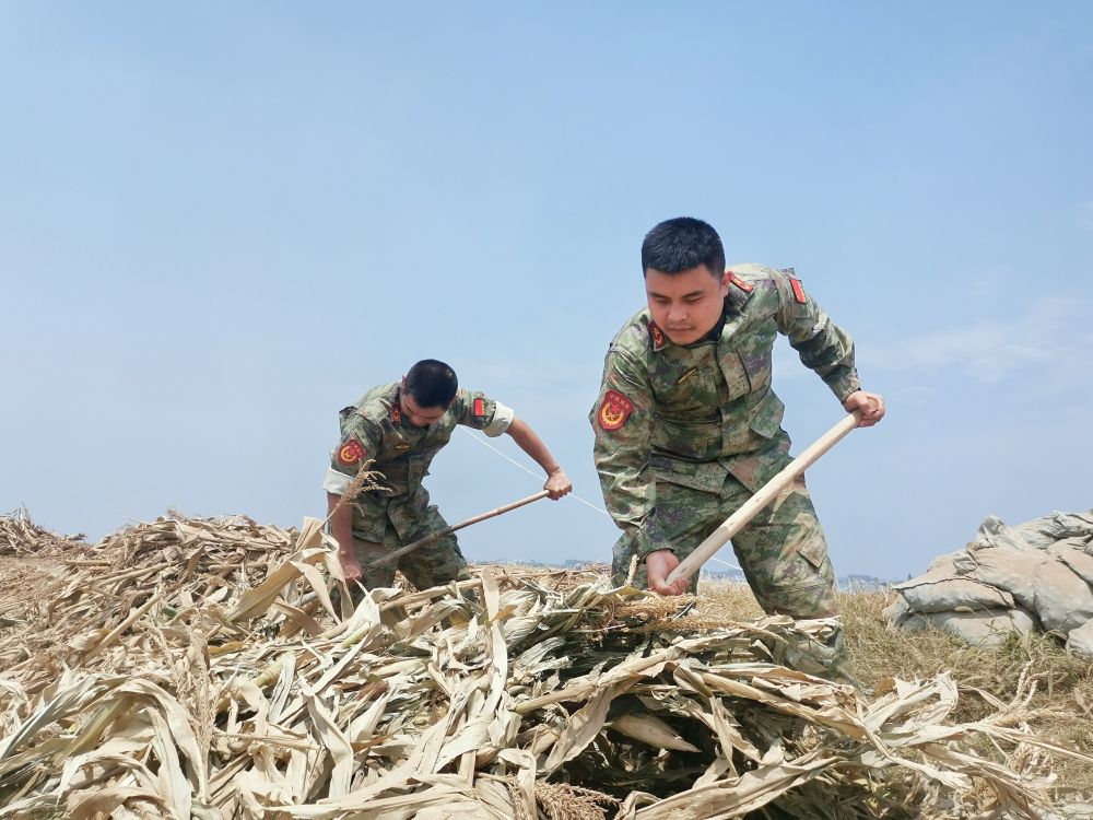 7月10日,冷濤(右)和隊(duì)友在錢團(tuán)間堤上進(jìn)行加固作業(yè)。(肖騰 攝)
