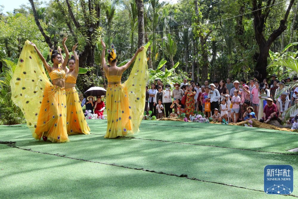 在云南省西雙版納傣族園景區(qū)內(nèi)的傳統(tǒng)傣寨曼聽村,游客觀看戶外孔雀舞表演(7月7日攝)。新華社發(fā)(李云生 攝)