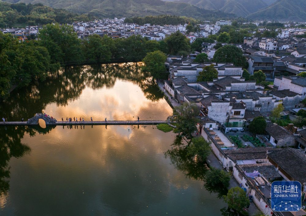 7月7日,游客在安徽省黃山市黟縣宏村游玩(無人機照片)。新華社記者 杜宇 攝