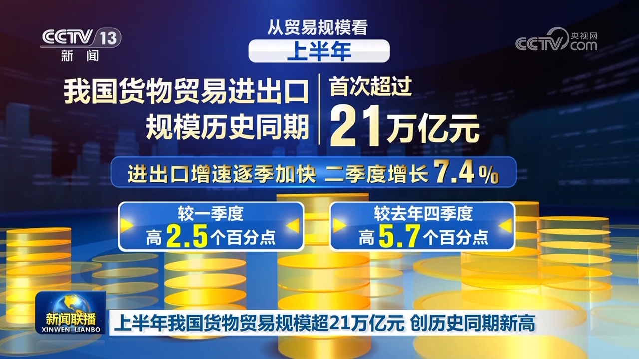 從貿(mào)易規(guī)???,上半年,我國貨物貿(mào)易進出口規(guī)模歷史同期首次超過21萬億元。進出口增速逐季加快,二季度增長7.4%,較一季度和去年四季度分別高2.5個、5.7個百分點,貨物貿(mào)易進出口質量持續(xù)提升、規(guī)模較快增長。