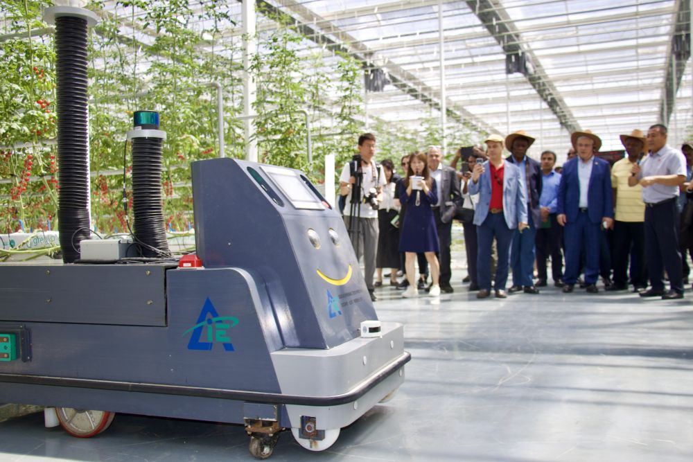7月12日,駐華使節(jié)走訪鄂爾多斯市達拉特旗德農(nóng)現(xiàn)代高效設施農(nóng)業(yè)產(chǎn)業(yè)園,觀看巡檢機器人工作。新華社記者 劉嵐?jié)?攝