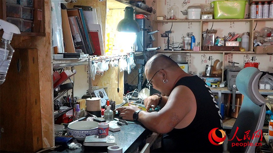 守藝工作室蘇力迪正在研究顧客定制的銀飾品樣式。高旭攝