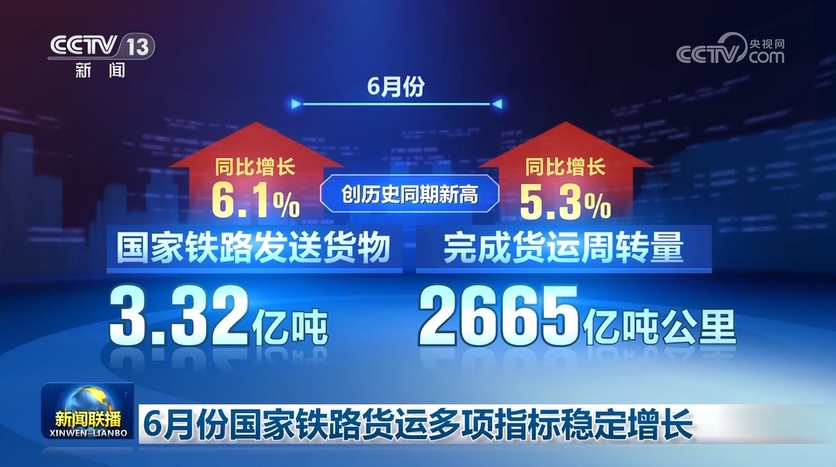 國鐵集團數據顯示,6月份,國家鐵路發(fā)送貨物3.32億噸,完成貨運周轉量2665億噸公里,同比分別增長6.1%、5.3%,創(chuàng)歷史同期新高。目前,我國鐵路貨運量、貨運周轉量等指標穩(wěn)居世界首位。