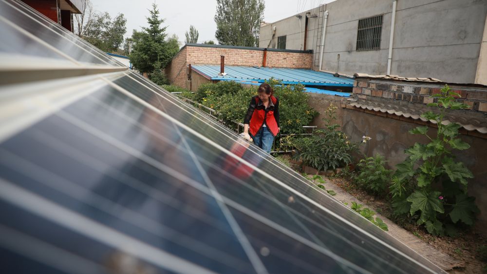 通渭縣油坊村村民全小萍正在擦拭自己家中的光伏板。新華社記者 張睿 攝