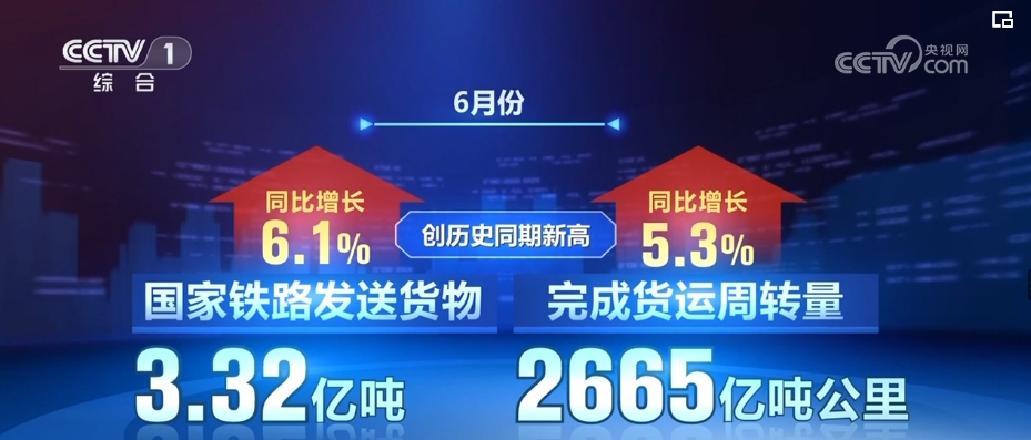 記者7月14日從國鐵集團獲悉,6月份,國家鐵路發(fā)送貨物3.32億噸,完成貨運周轉(zhuǎn)量2665億噸公里,同比分別增長6.1%、5.3%,創(chuàng)歷史同期新高。