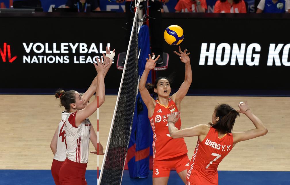 6月16日,中國(guó)隊(duì)球員刁琳宇(右二)在比賽中傳球。當(dāng)日,在世界女排聯(lián)賽中國(guó)香港站比賽中,中國(guó)隊(duì)3比0戰(zhàn)勝波蘭隊(duì)。新華社記者 盧炳輝 攝