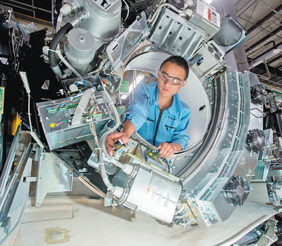 北京經(jīng)濟(jì)技術(shù)開(kāi)發(fā)區(qū)永昌北路1號(hào),通用電氣醫(yī)療北京影像設(shè)備制造基地(以下簡(jiǎn)稱“北京生產(chǎn)基地”),生產(chǎn)線上機(jī)器轟鳴,一臺(tái)臺(tái)醫(yī)療器械陸續(xù)完成裝配。通用電氣醫(yī)療在全球銷售的每三臺(tái)CT機(jī)中就有2臺(tái)產(chǎn)自這里,產(chǎn)品銷往全球100多個(gè)國(guó)家和地區(qū)。