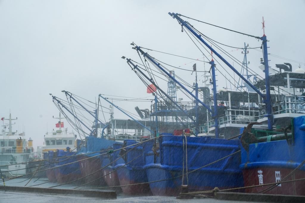 7月25日下午,在位于福建省莆田市秀嶼區(qū)埭頭鎮(zhèn)的石城國家一級漁港,今年第3號臺風(fēng)“格美”的外圍風(fēng)圈已經(jīng)襲來。七八級的陣風(fēng)夾雜著豆大的雨點(diǎn)打在臉上,裹挾著三四米高的海浪拍擊著護(hù)堤,激起白茫茫一片水花。漁港里,100多艘大小船舶已在24日中午12點(diǎn)前回港,呈“半月環(huán)抱”狀整齊停泊,船舶間已用纜繩加固。