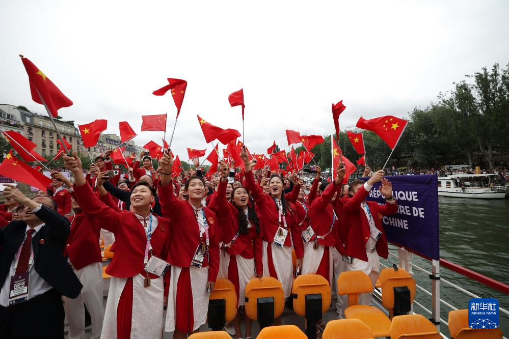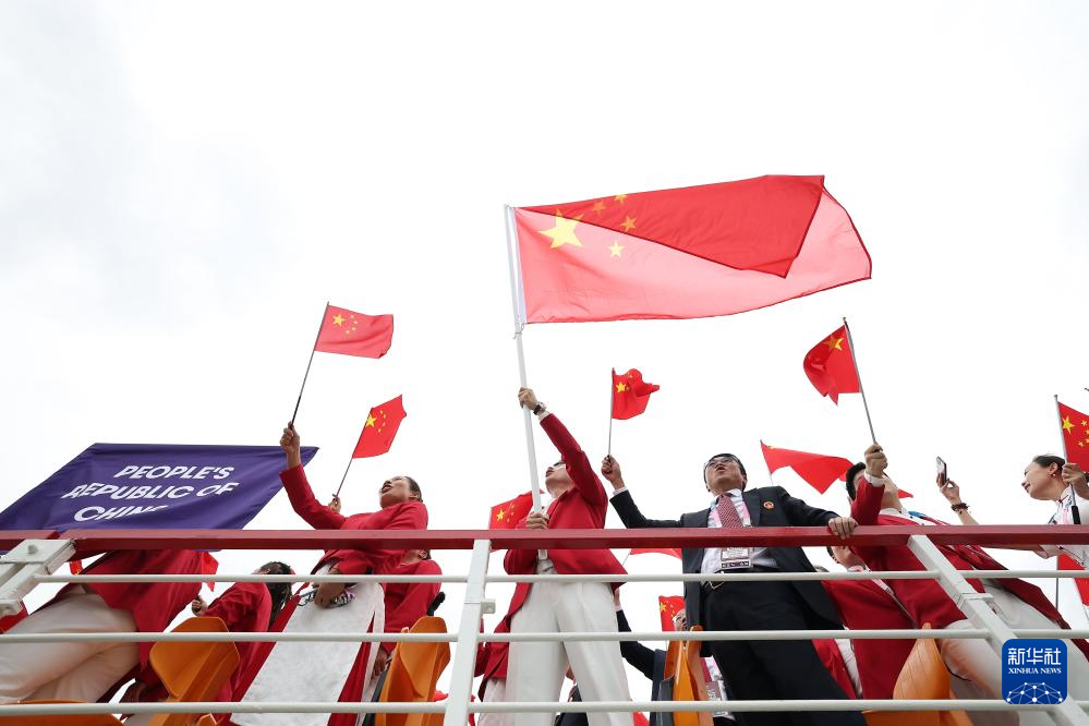 7月26日,中國體育代表團(tuán)成員在開幕式現(xiàn)場。新華社記者 王毓國 攝