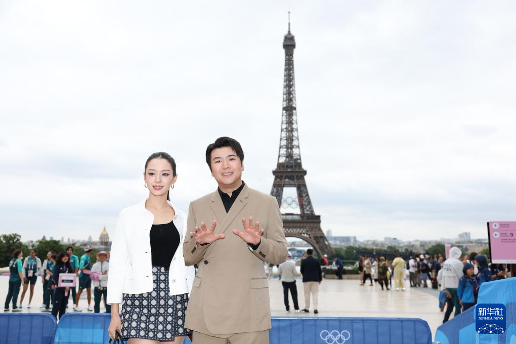 7月26日,中國體育代表團(tuán)旗手、乒乓球選手馬龍(左)與哥倫比亞體育代表團(tuán)成員在埃菲爾鐵塔前相互致意。新華社記者 李明 攝