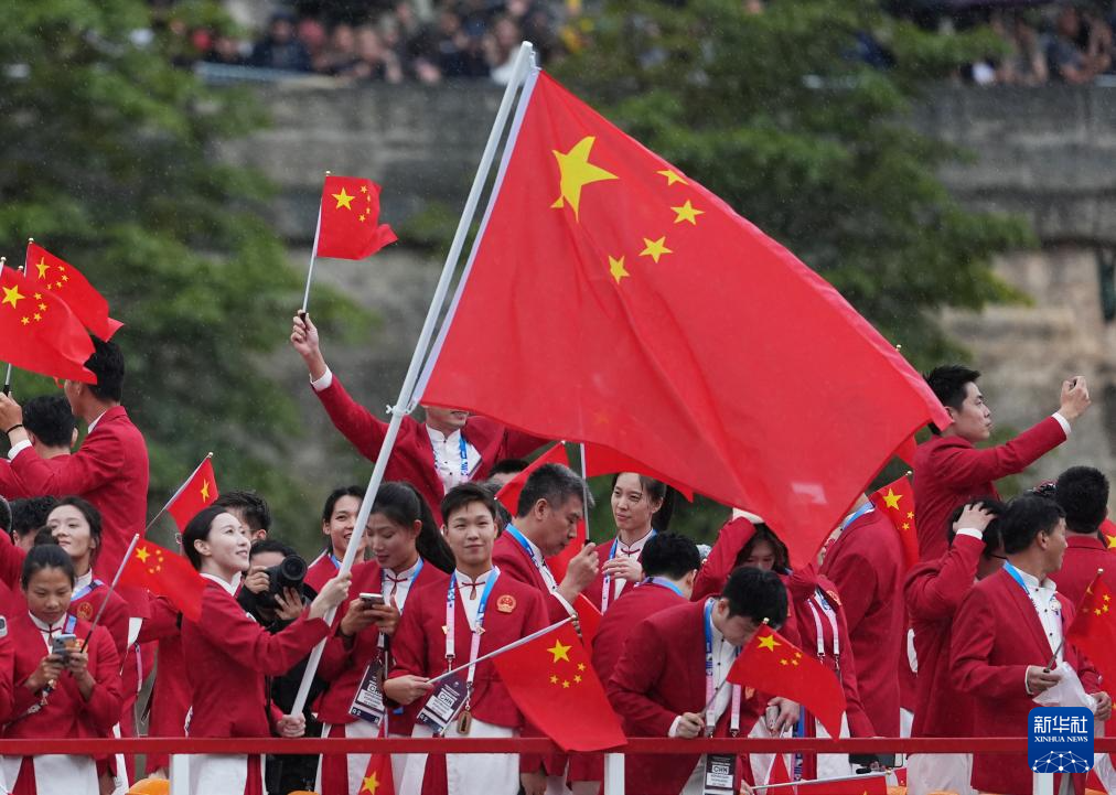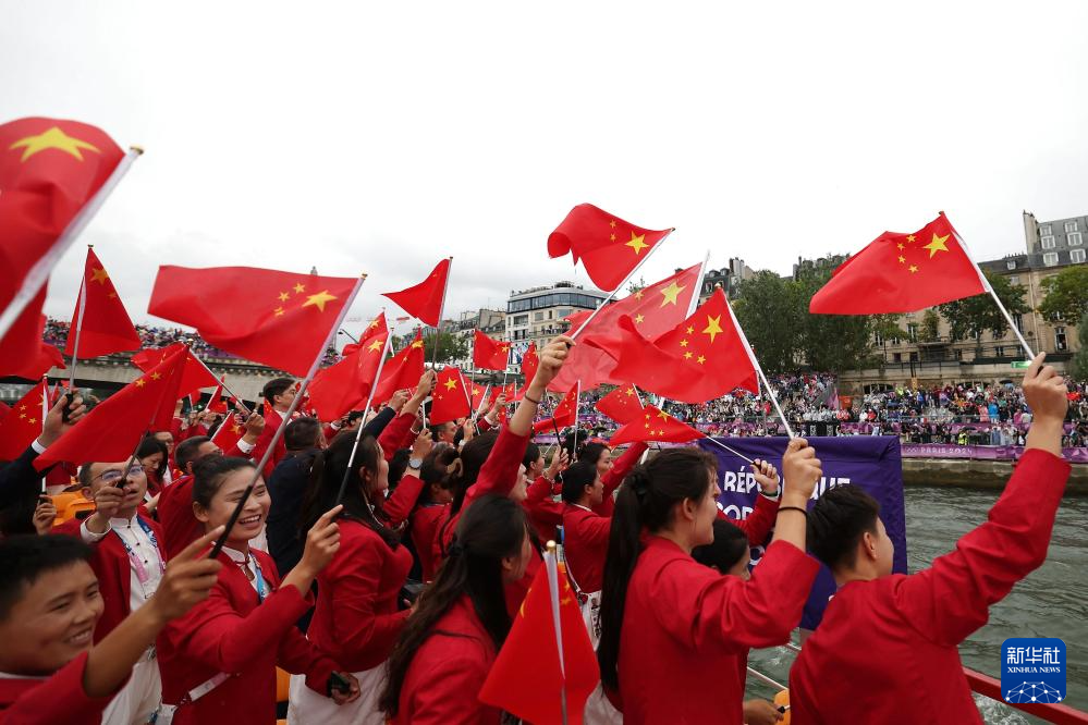 7月26日,中國體育代表團(tuán)旗手、花樣游泳選手馮雨在開幕式上揮舞國旗。新華社記者 曹燦 攝