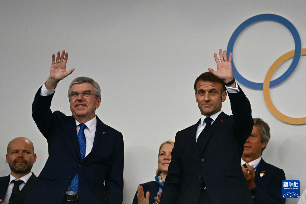 7月26日,國際奧委會主席巴赫(上左)和法國總統(tǒng)馬克龍出席開幕式。新華社記者 高靜 攝