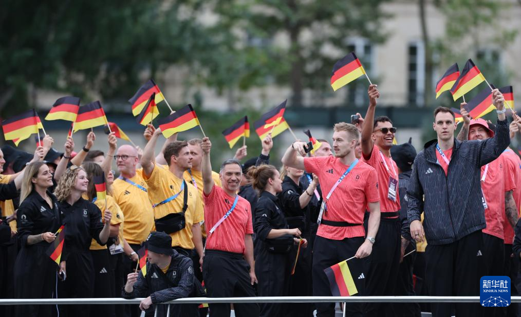 7月26日,德國體育代表團(tuán)成員在開幕式上慶祝。新華社記者 李明 攝pagebreak