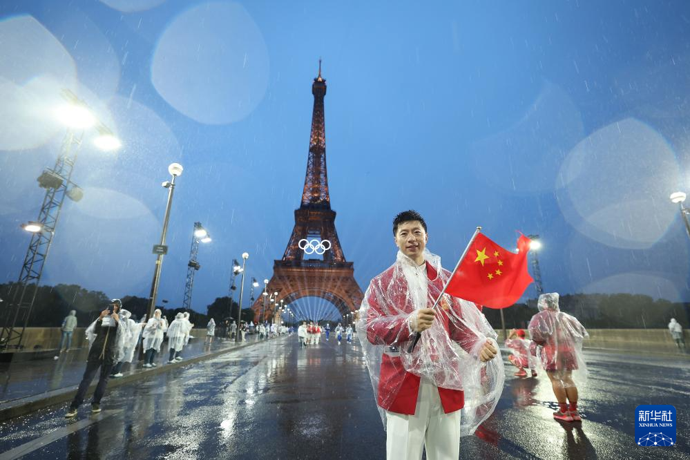 7月26日,中國體育代表團(tuán)旗手、乒乓球選手馬龍?jiān)诎7茽栬F塔前。新華社記者 李明 攝