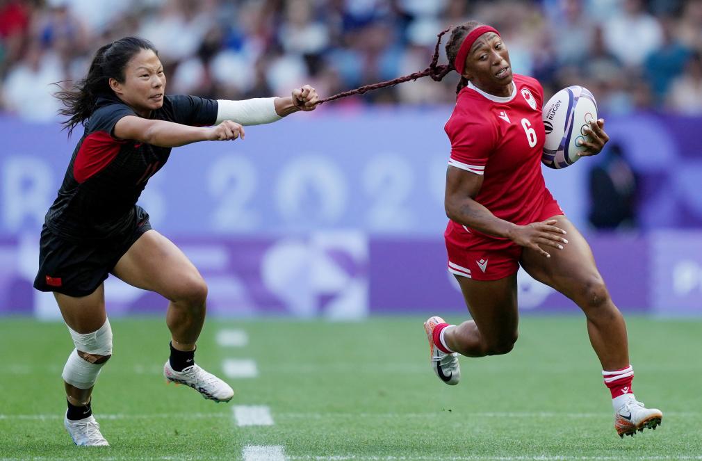 7月29日,中國(guó)隊(duì)球員劉瀟倩(左)與加拿大隊(duì)球員夏麗蒂·威廉姆斯在比賽中。當(dāng)日,在巴黎奧運(yùn)會(huì)七人制橄欖球女子分組循環(huán)賽A組比賽中,中國(guó)隊(duì)17比26不敵加拿大隊(duì)。 新華社記者 呂小煒 攝