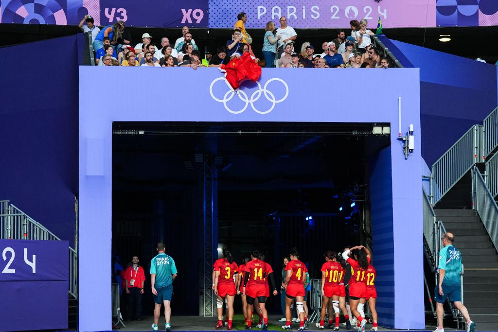 7月29日,中國(guó)隊(duì)選手劉瀟倩(右三)在賽后退場(chǎng)時(shí)向觀眾“比心”。當(dāng)日,在巴黎奧運(yùn)會(huì)七人制橄欖球女子四分之一決賽中,中國(guó)隊(duì)5比55不敵新西蘭隊(duì)。 新華社記者 許暢 攝