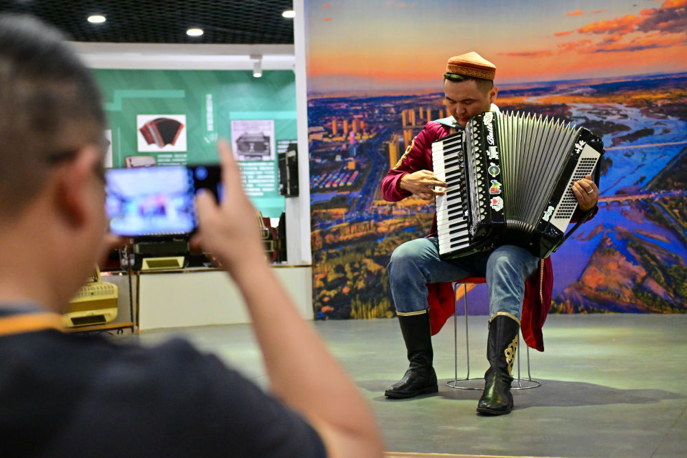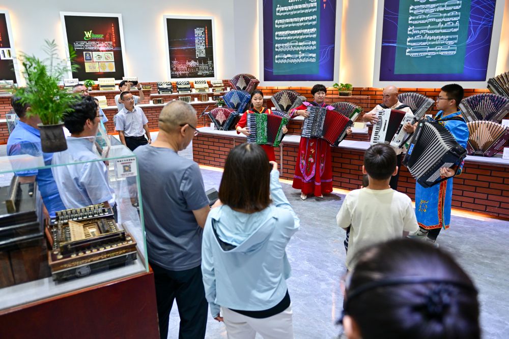 游客在新疆塔城市手風(fēng)琴文化展示廳欣賞手風(fēng)琴表演(7月24日攝)。