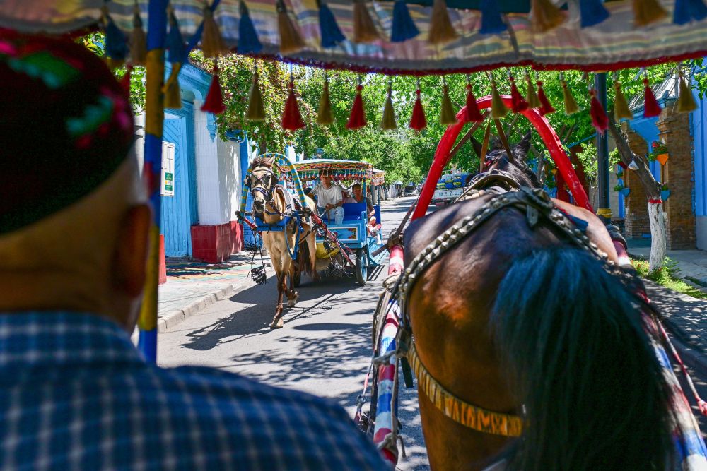 在伊犁哈薩克自治州伊寧市喀贊其民俗旅游區(qū),游客乘坐馬車(chē)觀光游覽(7月27日攝)。