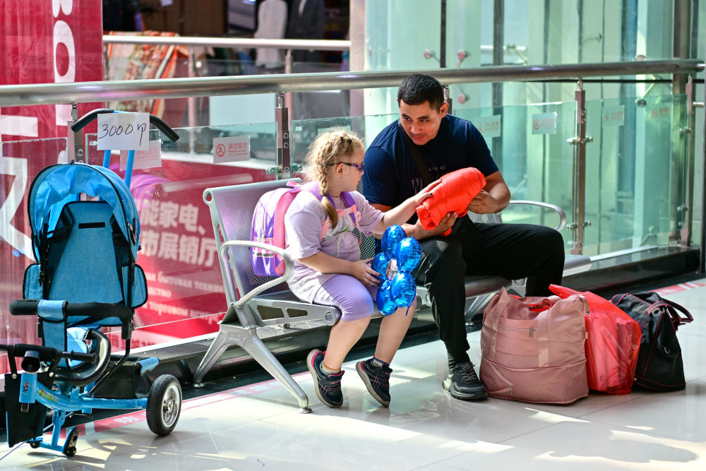 在中哈霍爾果斯國(guó)際邊境合作中心,來(lái)自哈薩克斯坦的游客在購(gòu)物后休息(7月27日攝)。
