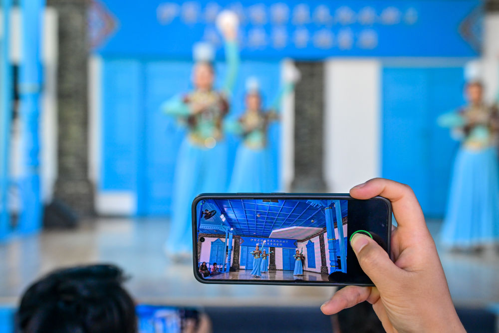 在伊犁哈薩克自治州伊寧市喀贊其民俗旅游區(qū),游客在錫伯車(chē)馬店欣賞文藝表演(7月27日攝)。