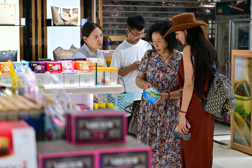 在中哈霍爾果斯國(guó)際邊境合作中心,游客在免稅店挑選商品(7月26日攝)。