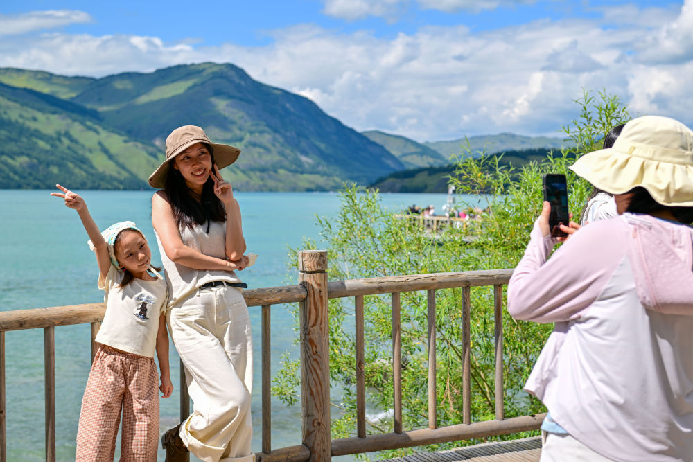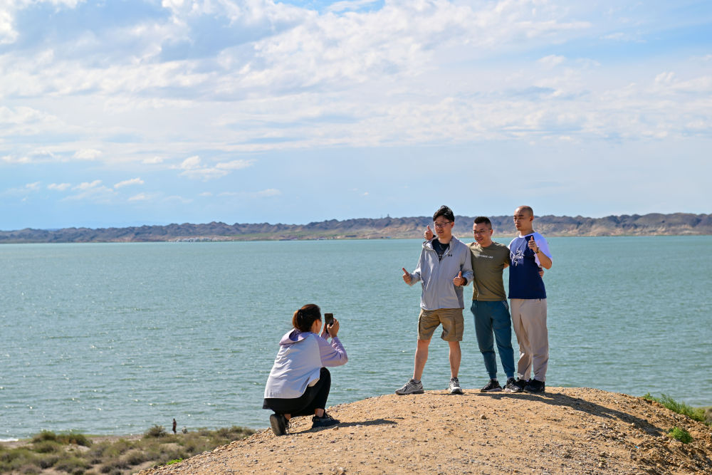 游客在新疆阿勒泰地區(qū)福??h烏倫古湖合影留念(7月21日攝)。