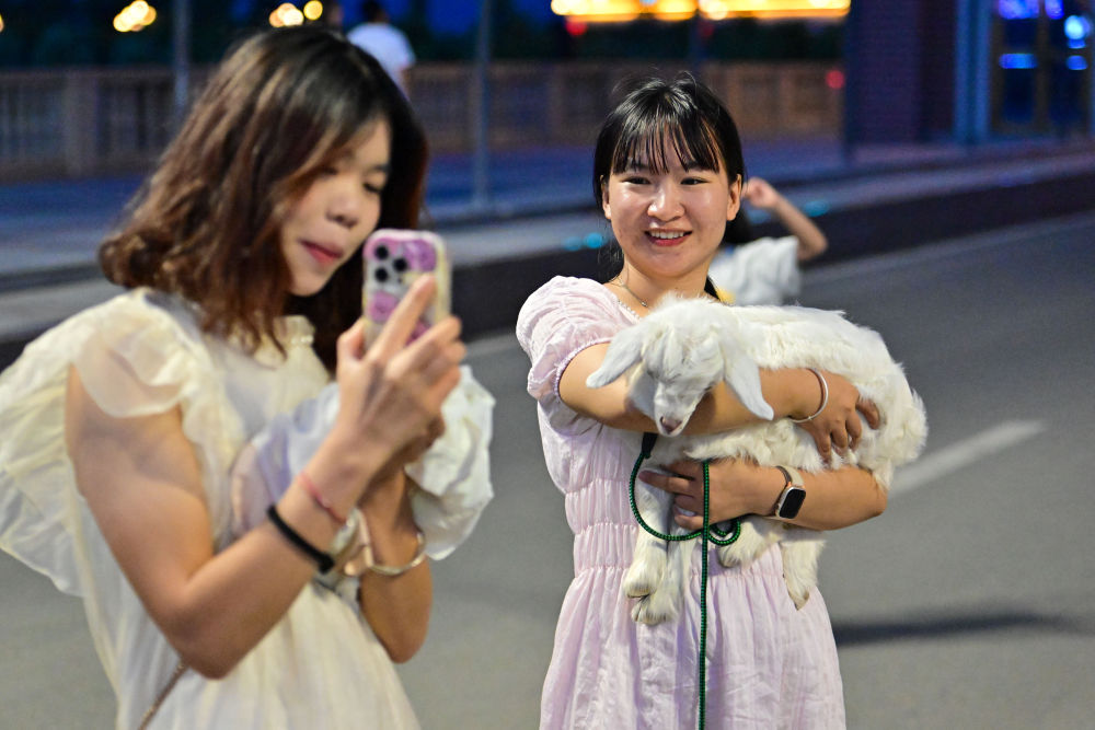 游客在新疆布爾津縣七彩河休閑旅游度假區(qū)抱著小羊拍照(7月21日攝)。