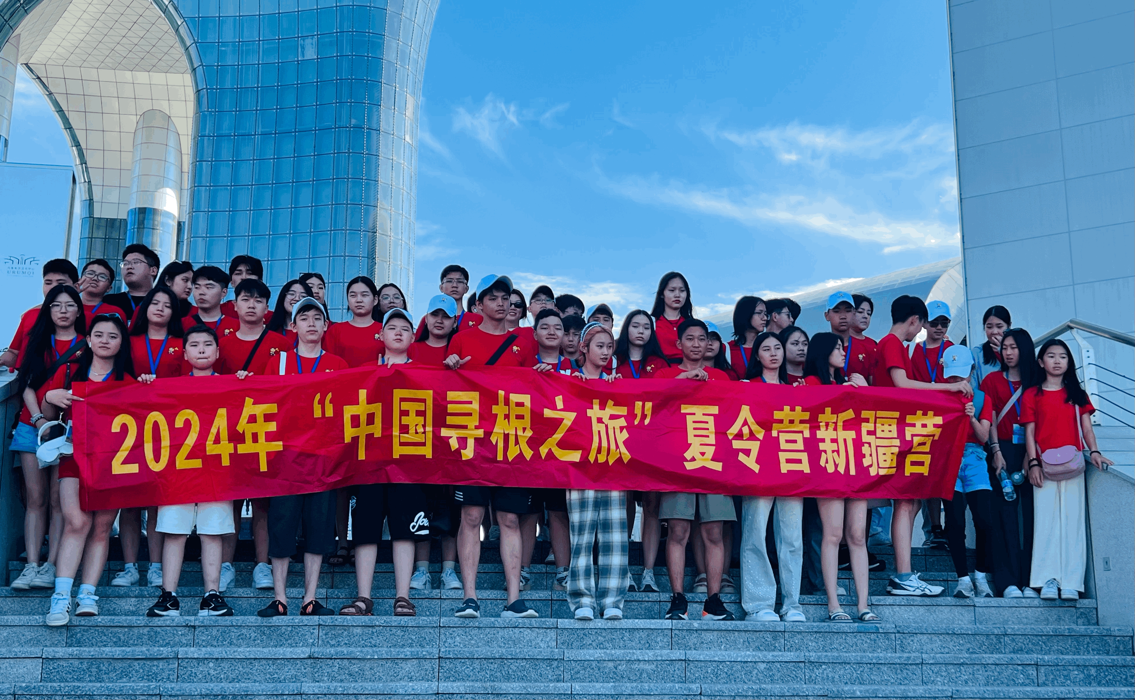 7月20日,營員們在烏魯木齊文化中心參觀游覽時合影留念。天山網(wǎng)-新疆日報記者 司路路攝