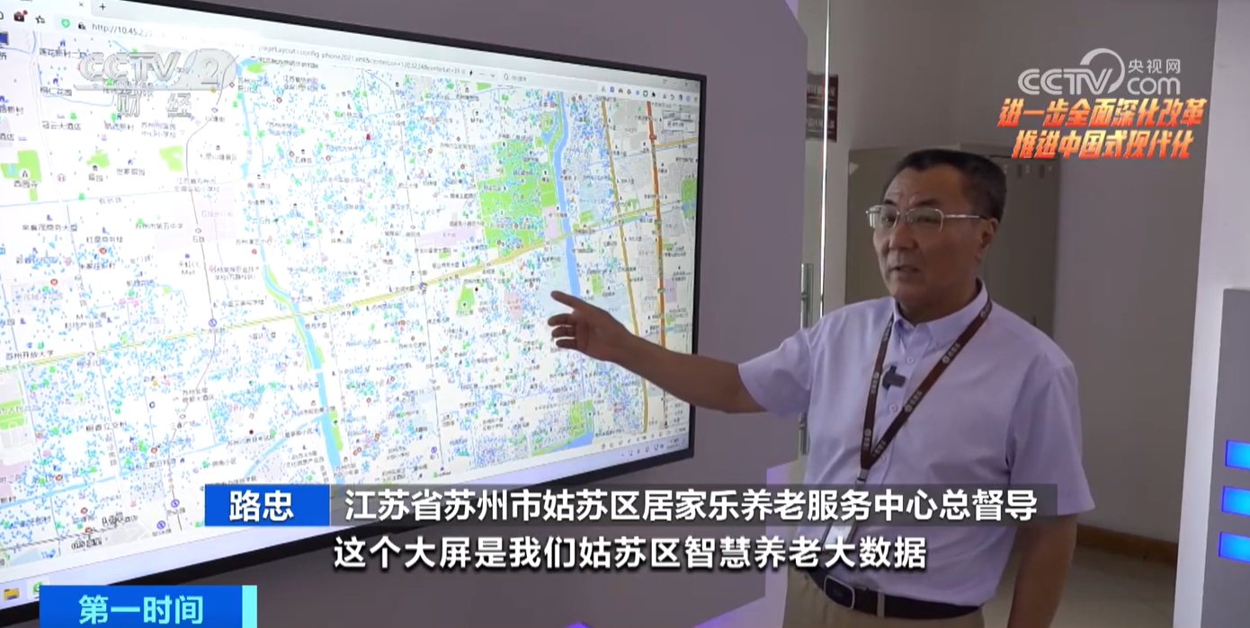 江蘇蘇州姑蘇區(qū)居家樂(lè)養(yǎng)老服務(wù)中心總督導(dǎo)路忠介紹,這個(gè)大屏是姑蘇區(qū)智慧養(yǎng)老大數(shù)據(jù)在線實(shí)時(shí)的數(shù)字地圖,粉色的點(diǎn)就是現(xiàn)在正在服務(wù)中的284戶老人,綠色的點(diǎn)位就是現(xiàn)在還有900多個(gè)老人在等待著上門(mén)服務(wù),大量的藍(lán)色的小點(diǎn)是服務(wù)用戶,是整個(gè)“虛擬養(yǎng)老院”的老人。
